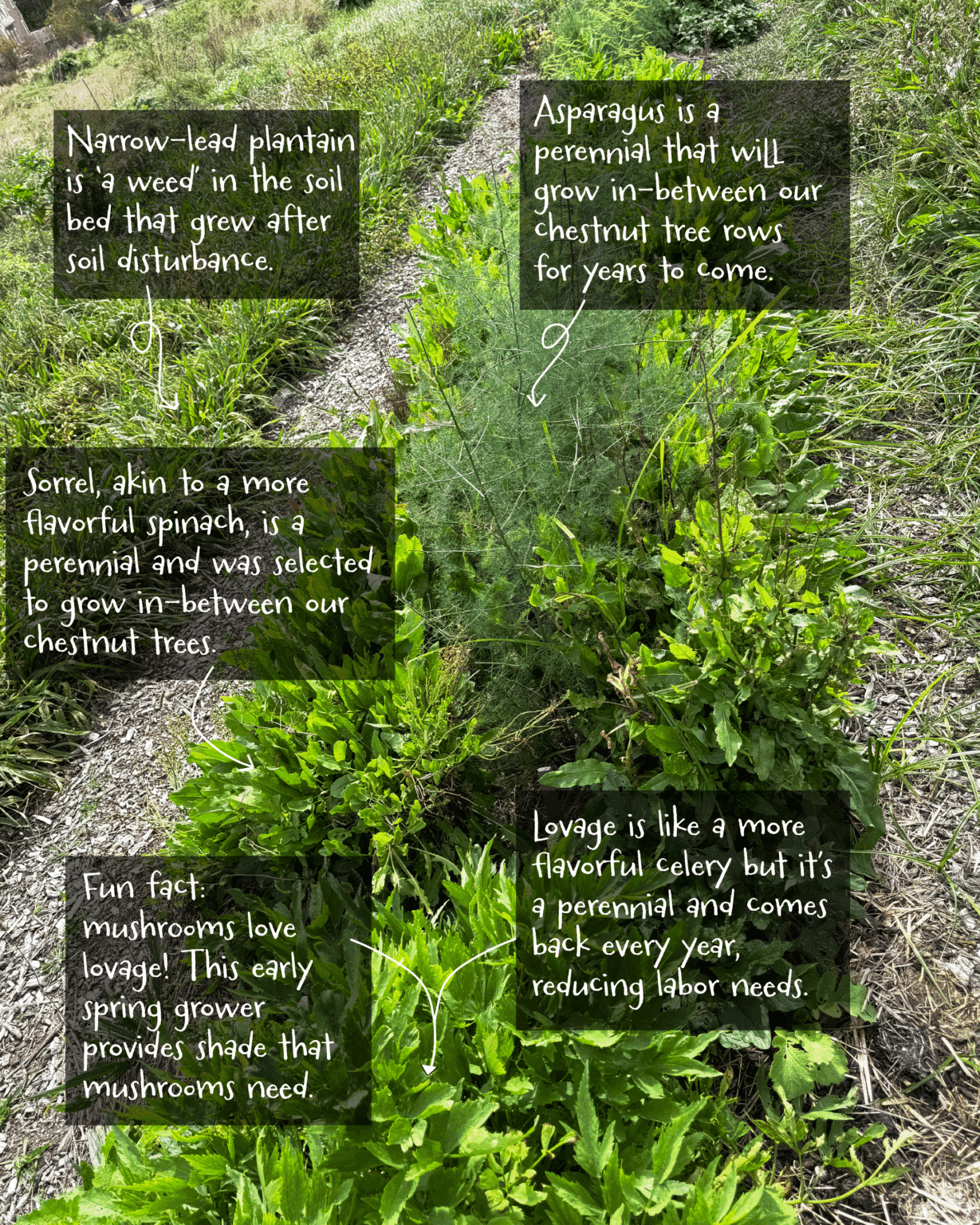 Here at Ocean Hour Farm, we have been experimenting with different disturbance techniques in order to study and learn from both traditional indigenous and conventional modern agricultural methods. Within our chestnut tree alleyway plot, the soil was disturbed in two ways: grassy topsoil was turned over in order to form mounds in the traditional indigenous manner, and the conventional row was heavily disturbed using a plow to break the soil up.