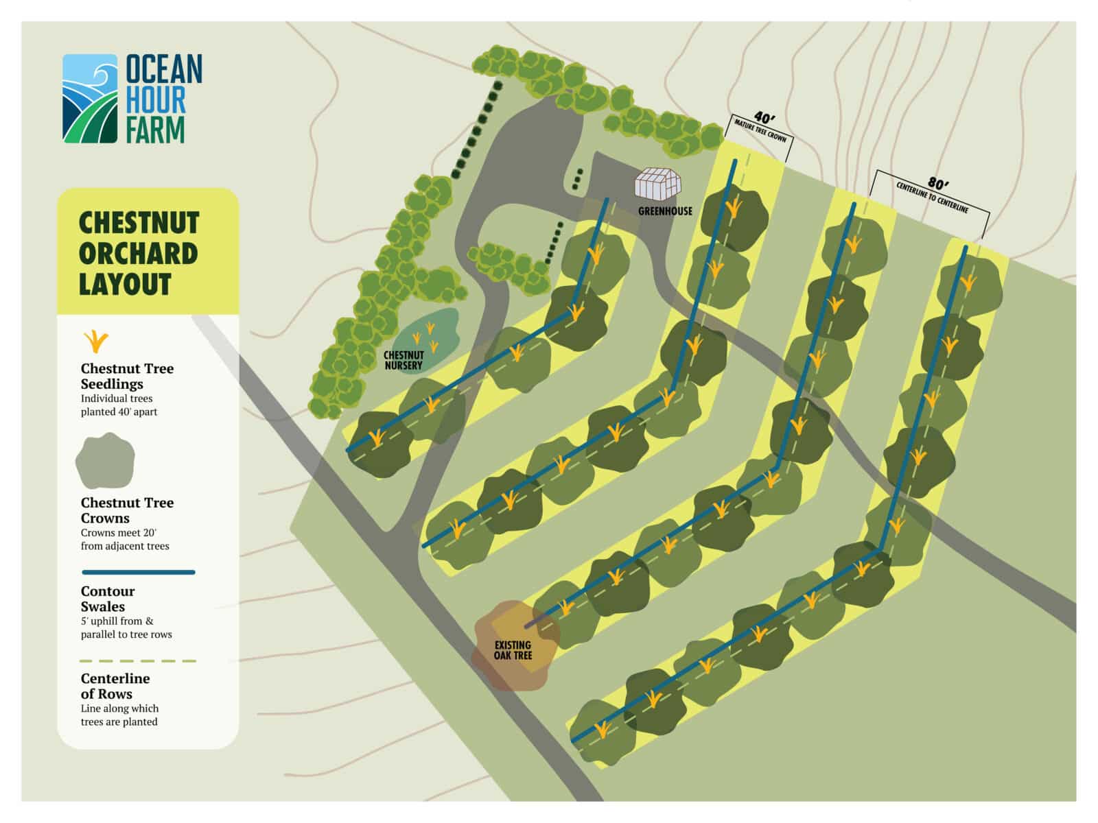 Trees are integrated into our landscape all across Ocean Hour Farm. In our perennial pastures, where our livestock spend their days grazing in rotation, sixty young linden trees provide shade and shelter, and as they grow, their leaves and flowers will offer an early food source for the grazers and the bees in spring. When the linden trees are old enough, we’ll coppice them and use their wood for fenceposts.